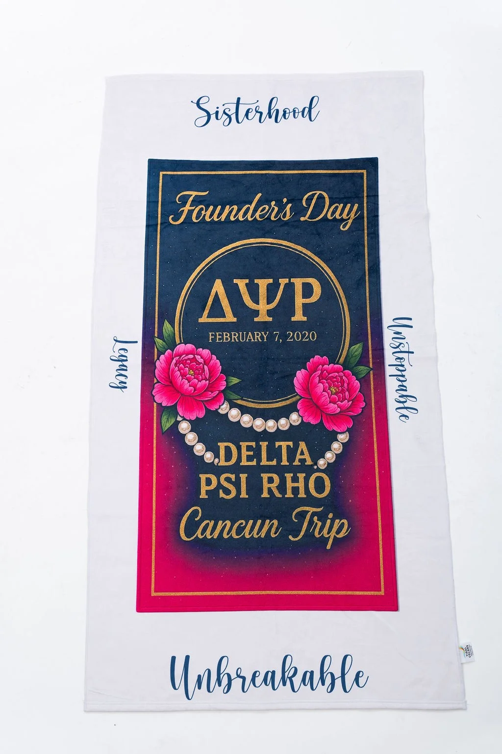 Celebrate sisterhood in style with this stunning Delta Psi Rho Founders Day beach towel and decorative throw. Designed with elegance and meaning, this piece features a rich navy-to-hot-pink gradient framed in gold, highlighted by bold gold Greek letters ΔΨΡ and the founding date February 7, 2020. Vibrant pink peonies, a pearl necklace detail, and refined gold typography bring a luxe, feminine touch that honors legacy and unity.
